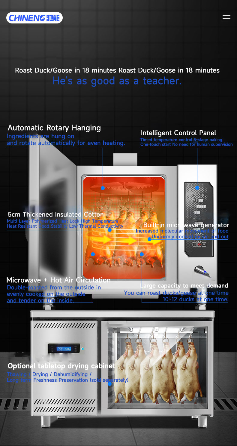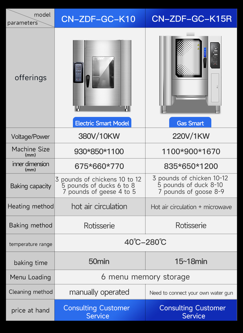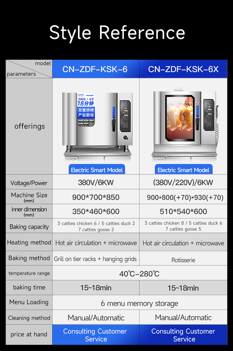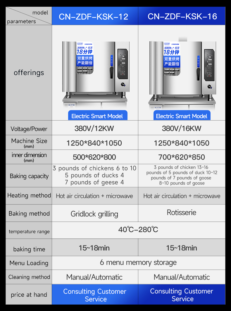 Cooking Capacity: 10~12 chickens of three pounds/6~8 ducks of five pounds/4~5 geese of seven pounds