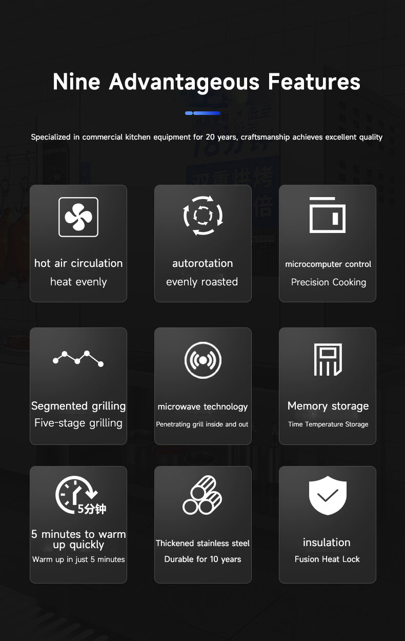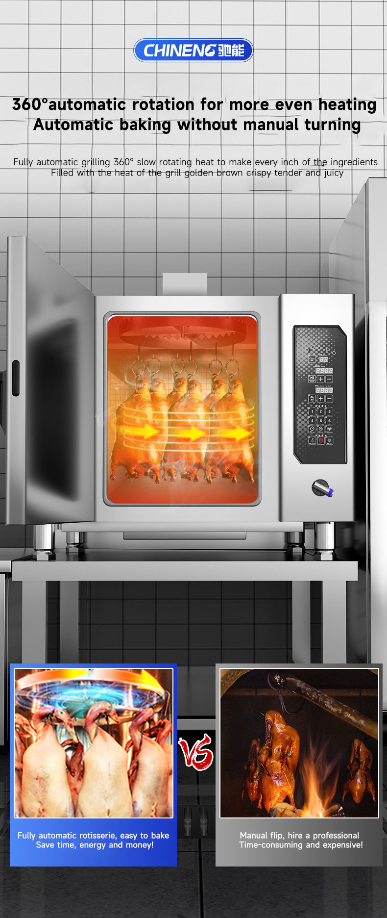 Cooking Capacity: 8 chickens of three pounds/6 ducks of five pounds/5 geese of seven pounds