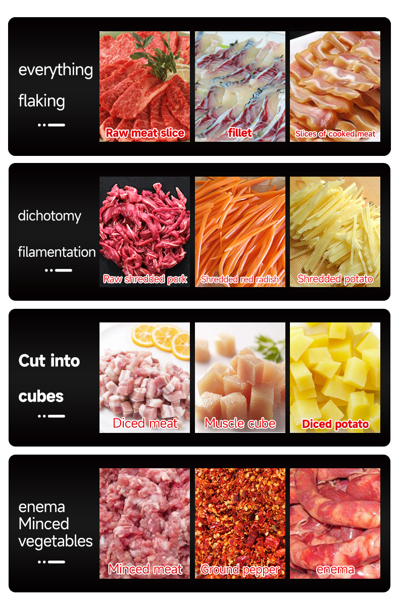 Machine Function: Grinds meat / Vegetables / Makes sauce / Stuffs sausage / Slices