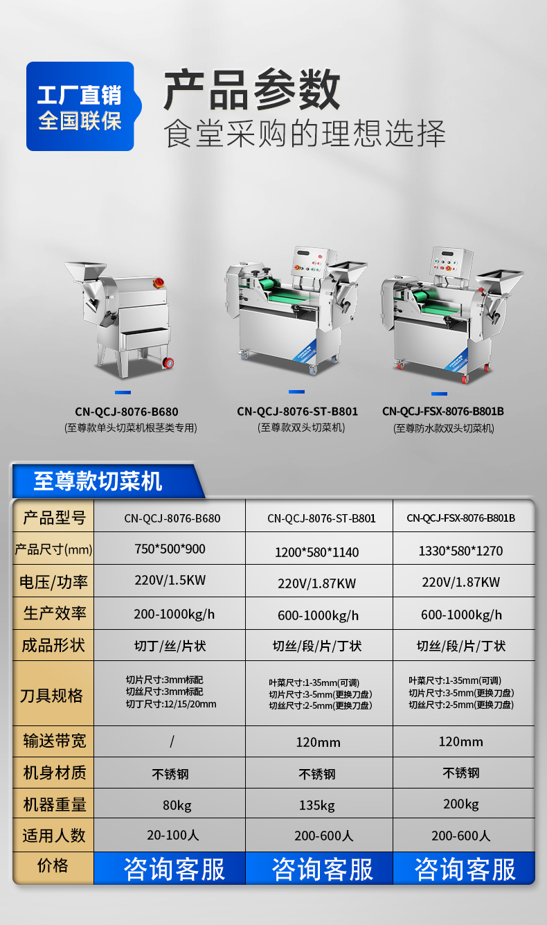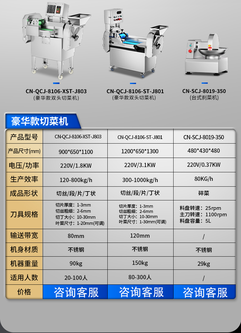 刀具规格:叶菜标配刀具:2支菜叶大刀 切片刀盘:1-15mm 切丝刀盘:2-10mm 切丁刀盘:10/12/15/20mm(6/8/25/30可定制)